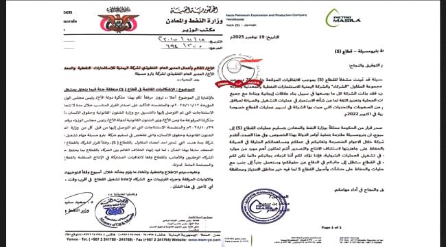 كشفت وثائق رسمية عن قيام الشركة اليمنية للاستثمارات النفطية والمعدنية (وايكم) بإصدار توجيهات بنقل تشغيل القطاع النفطي رقم (5) من شركة بترومسيلة الحكو