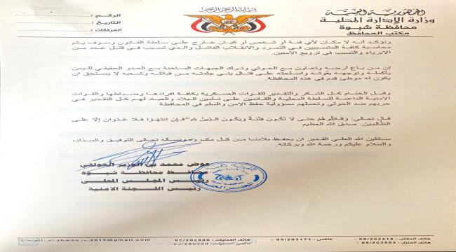 واختتم المحافظ بيانه بتوجيه الشكر للقوات العسكرية بكافة افرادها وضباطها والقوات الأمنية الداعمة للسلطة المحلية لتحملهم مسؤولية حفظ الأمن