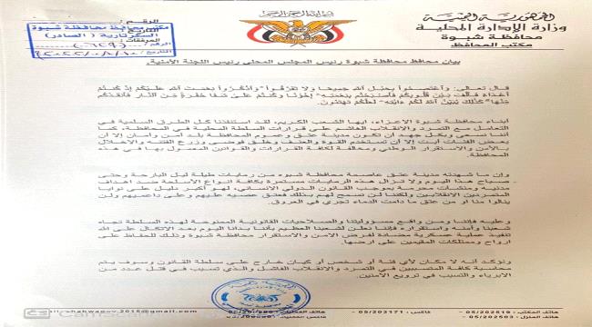 اعلن محافظ شبوة عوض بن الوزير صباح اليوم الأربعاء بدء تنفيذ عملية عسكرية مضادة لفرض الأمن والاستقرار في شبوة والحفاظ على ارواح وممتلكات المقيمين على اراضيها