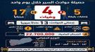 سجلت شرطة السير يوم الإثنين المنصرم 13 حادثاً مرورياً في عدد من المحافظات، شملت 9 حوادث تصادم، و3 حوادث انقلاب، وحادثة دهس مشاة. وأدت الحوادث إلى وفاة