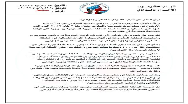 "نـــص الـــبــيــان": يراقب شباب حضرموت الأحرار بالوادي المشهد السياسي عن ما آلت إليه الأوضاع في حضرموت خصوصاً والجنوب عامة، منذ 2 يناير اليوم الذي ش