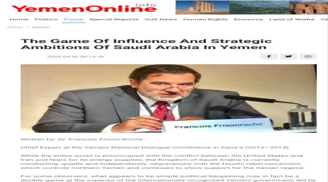 كشف تقرير تحليلي للخبير الفرنسي د. فرانسوا فريسون روش، نشره موقع Global Strat View، أن التحركات السعودية في اليمن لم تعد تندرج ضمن إطار تسوية سياسية ت