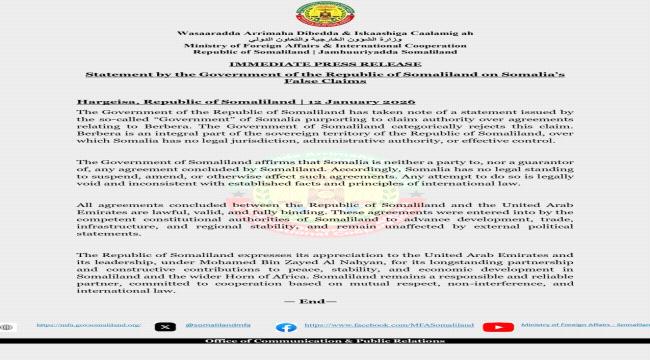 أكدت حكومة أرض الصومال أن الحكومة الفيدرالية في الصومال لا تملك أي صلاحيات قانونية أو ولاية قضائية على أراضيها أو على الاتفاقيات التي تبرمها مع دول أخ