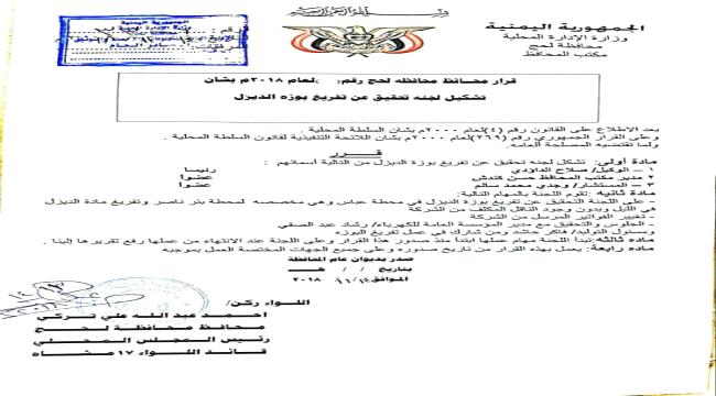 أصدر محافظ محافظة لحج قائد اللواء ١٧مشاه اللواء الركن /احمد عبدالله تركي قرار بتشكيل لجنة للتحقيق مع مدير مؤسسة الكهرباء ورئيس قسم التوليد بالمحطة .