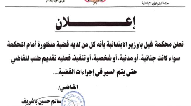أعلنت محكمة غيل باوزير الابتدائية عن دعوة عامة لكل من لديه قضية منظورة أمام المحكمة، سواء كانت جنائية أو مدنية أو قضايا شخصية أو تنفيذية، لتقديم طلباتهم إلى القاضي المختص.