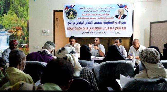 نظّمت الإدارة التنظيمية بالهيئة التنفيذية للقيادة المحلية للمجلس الانتقالي الجنوبي في محافظة لحج، اليوم الخميس، لقاءً تشاوريًا مع رؤساء اللجان المحلية للمجلس في مراكز مديرية الحوطة.