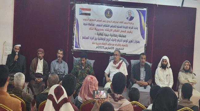 نظم قسم الفكر والإرشاد الديني في الهيئة التنفيذية للقيادة المحلية للمجلس الانتقالي الجنوبي، في مديرية عتق بمحافظة شبوة، اليوم الخميس، مسابقة رمضانية ثقافية تحت شعار "تعزيز الوعي الديني وإحياء الروح الرمضانية".