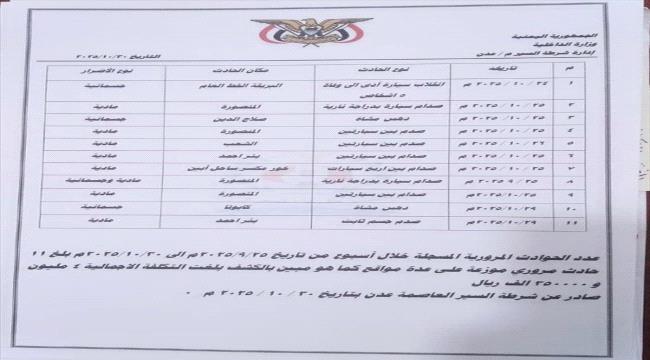 سجلت شرطة السير بالعاصمة عدن خلال الفترة من 25 وحتى 30 أكتوبر 2025م، عدد (2399) مخالفة مرورية بمختلف أنواعها، وذلك وفقاً للكشف الأسبوعي الصادر عن الإد