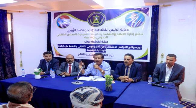 نظّمت إدارة الإعلام والثقافة بالهيئة التنفيذية للقيادة المحلية للمجلس الانتقالي الجنوبي بمحافظة شبوة، اليوم الثلاثاء، حلقة نقاشية بعنوان: "دور مواقع التواصل الاجتماعي في تعزيز الوعي الثقافي والحفاظ على الهوية الوطنية الجنوبية"، بحضور أعضاء فريق التوجيه والرقابة الرئاسي.