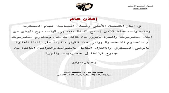 أصدر مركز القيادة والسيطرة لقوات الدعم الأمني بمحافظة حضرموت، يوم الأحد، تعميماً يقضي بالسماح لكافة منتسبي قوات "درع الوطن" من أبناء محافظتي حضرموت وا