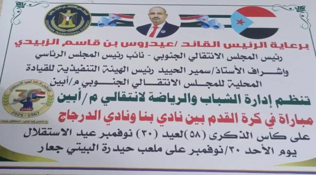 يستعد ملعب الفقيد حيدرة البيتي بمدينة جعار بمديرية خنفر محافظة أبين، يوم غدٍ الأحد، لاستضافة لقاء كروي يجمع فريقي بَنَا والدَّرْجَاج، وذلك على كأس الذ