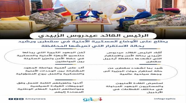 الرئيس الزُبيدي يطّلع على الأوضاع العسكرية الأمنية في سقطرى ويشيد بحالة الاستقرار التي تعيشها المحافظة..انفوجرافيك