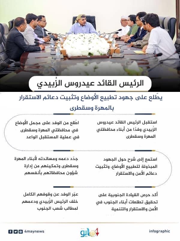 الرئيس القائد عيدروس الزُبيدي يطّلع على جهود تطبيع الأوضاع وتثبيت دعائم الاستقرار بالمهرة وسقطرى