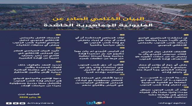 البيان الختامي الصادر عن المليونية الجماهيرية الحاشدة (العاصمة عدن – خور مكسر – ساحة العروض.. انفوجرافيك