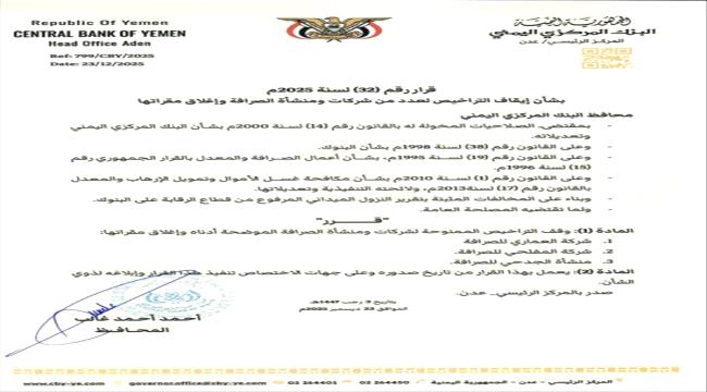 مركزي عدن يصدر قرارين بسحب وإيقاف تراخيص عدد من شركات ومنشآت الصرافة ...