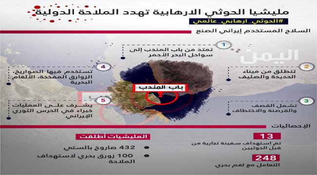 وتمتد التهديدات الحوثية للملاحة الدولية - التي تنطلق من ميناءي الحديدة والصليف - من باب المندب إلى سواحل البحر الأحمر، وتشمل تشمل القصف والقرصنة والاختطاف، حسب تصريحات للتحالف العربي.