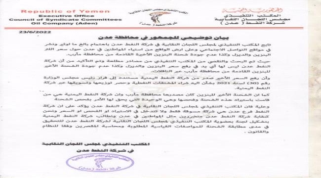 أصدر المكتب التنفيذي لمجلس اللجان النقابية في شركة النفط بعدن بيانا توضيحيا حول استياء المواطنين من قيام الشركة برفع اسعار المشتقات النفطية بعدن.