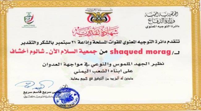 منحت مليشيا جماعة الحوثي شهادة شكر وعرفان لمنظمة إسرائيلية يرأسها اليهودي شالوم أخشاف.