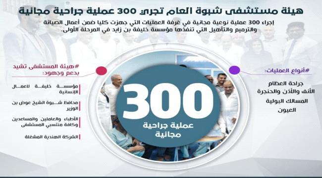 أعلنت هيئة مستشفى شبوة عن إجراء 300 عملية نوعية مجانية في غرفة العمليات التي جهزت كليا ضمن أعمال الصيانة والترميم والتأهيل التي تنفذها مؤسسة خليفة بن زايد في المرحلة الأولى.