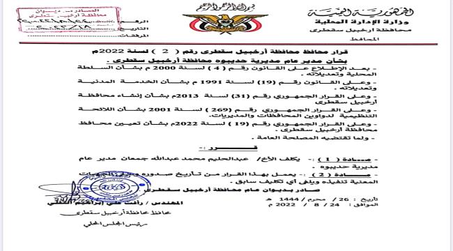 أصدر محافظ محافظة أرخبيل سقطرى المهندس "رأفت الثقلي"، اليوم، قراراً بتعيين مديراً عاماً لمديرية حديبو عاصمة المحافظة.