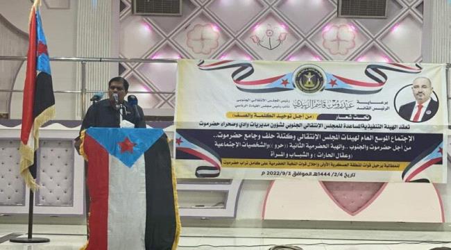 داعياً في كلمته الجميع إلى تغليب مصلحة حضرموت، من خلال العمل على تحريرها وإدارة شؤونها والاستفادة من خيراتها.