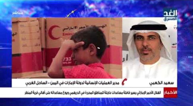 قال مدير العمليات الإنسانية لدولة الإمارات في اليمن "سعيد الكعبي "لقناة الغد المشرق: أن الأعمال الإنسانية والدعم اللوجستي المقدم من دولة الإمارات للأخوة في اليمن بشكل عام وفي المحافظات المحررة بشكل خاص مستمر ومتواصل .