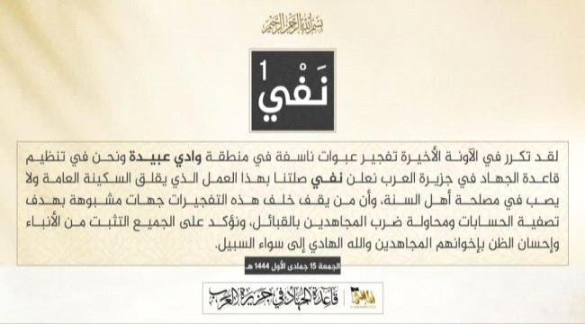 نشر تنظيم القاعدة في اليمن والذي يحمل أسم تنظيم قاعدة الجهاد في جزيرة العرب بيان نفي تناول فيه تنصله من تنفيذ عمليات التفجير الاخيرة في محافظة مأرب التي ترزح تحت حكم ميليشيات الاخوان المسلمين.