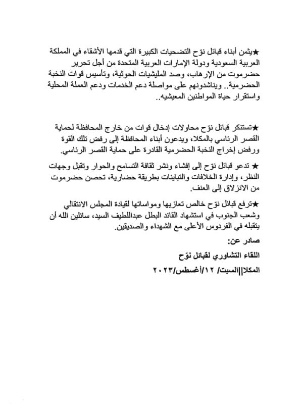 ★تستنكر قبائل نوّح محاولات إدخال قوات من خارج المحافظة لحماية القصر الرئاسي بالمكلا، ويدعون أبناء المحافظة إلى رفض تلك القوة ورفض إخراج النخبة الحضرمية القادرة على حماية القصر الرئاسي.