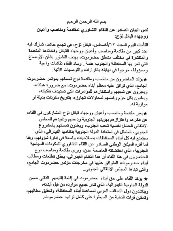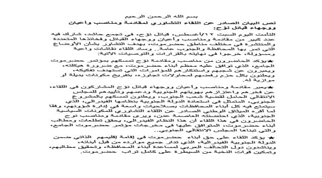 ★ يؤكد اللقاء على حق أبناء حضرموت في إقامة إقليمهم الذاتي ضمن الدولة الجنوبية الفيدرالية، الذي تدار جميع موارده من قبل أبنائه، ويناشدون دول التحالف العربي لمساعدة أبناء المحافظة، وتحقيق مطالبهم، وتمكين قوات النخبة من السيطرة على كامل تراب حضرموت.