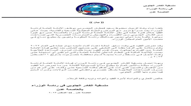 وبهذا تحمل منسقية الكادر الجنوبي في رئاسة الوزراء قيادة الأمانة العامة لرئاسة الوزراء ممثلة بالأمين العام م/ مطيع دماج المسؤولية الكاملة عن ما تعرض له الفقيد من الإهمال والتسيب التي أدت إلى تفاقم حالته الصحية حتى وفاته، على الرغم من صرف المساعدات العلاجية بشكل عنصري وانتقائي لكسب الولاءات وشراء الذمم فيما يحرم منها الكادر الجنوبي.